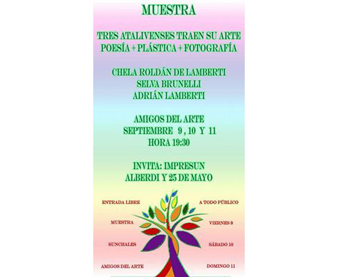 Chela Roldán de Lamberti, Selva Brunelli y Adrián Lamberti nos traen sus obras de arte el 9, 10 y 11 de septiembre a las 19:30 en Alberdi y 25 de Mayo.
