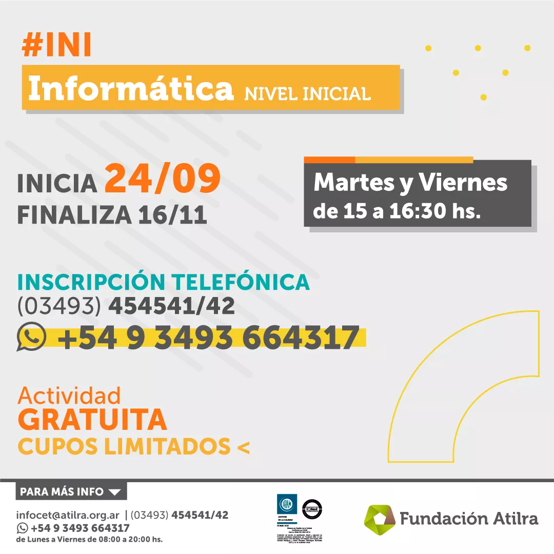 Fundación Atilra te invita a esta capacitación para quienes deseen comenzar su formación en la informática. Curso 100% virtual y gratuito. Cupos limitados. Inscripciones telefónicas: (03493) 454541/42 o por WhatsApp al +54 9 3493 664317.