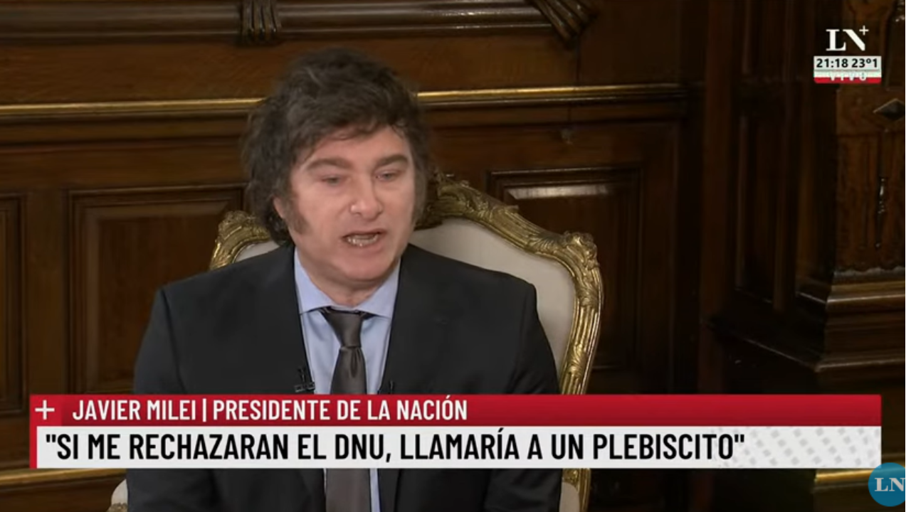 Anteriormente, el presidente Javier Milei (La Libertad Avanza) brindó una entrevista al canal La Nación+ en la que habló sobre el decreto de necesidad urgencia (DNU) que dictó el 20 de diciembre último. “En caso de que sea rechazado, ¿llamarías a una consulta popular, a un plebiscito?”, le preguntó el periodista Luis Majul. “Obviamente. Que me expliquen por qué el Congreso se pone en contra de algo que le hace bien a la gente”, respondió el Presidente.