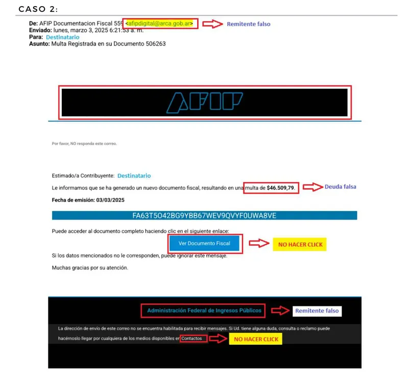 ARCA nunca utiliza correos electrónicos para solicitar pagos, datos personales o informar sobre situaciones judiciales. Tampoco se contacta por otros medios como WhatsApp, redes sociales o teléfono.os», concluyó.