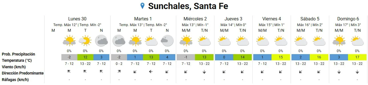 Este lunes, en la ciudad de Sunchales y alrededores, la mínima fue de -2º y la máxima apenas alcanzará los 10°, con viento leve a moderado del sudoeste.
